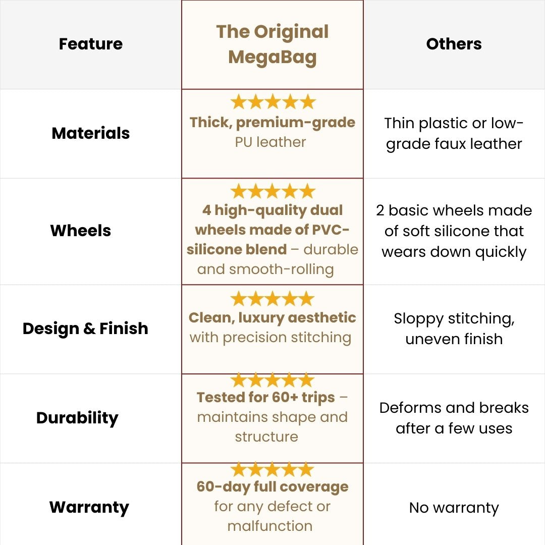 At Luxe Mega Bag, we are committed to providing you with premium-quality products without compromise. That’s why we offer an extended 60-day warranty from the date of purchase on all our bags. This warranty covers defects in materials and workmanship, so you can enjoy your bag with peace of mind.