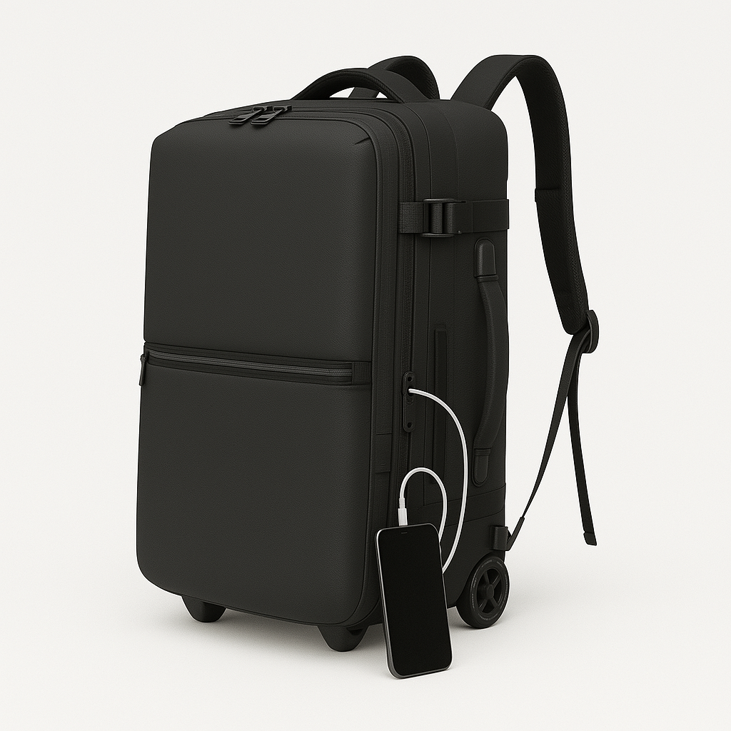 it’s a hybrid of a padded backpack and a sleek rolling trolley.The padded straps fold seamlessly into the back, while the retractable handle and built-in wheels give you smooth, effortless movement through airports, city streets, or office corridors.